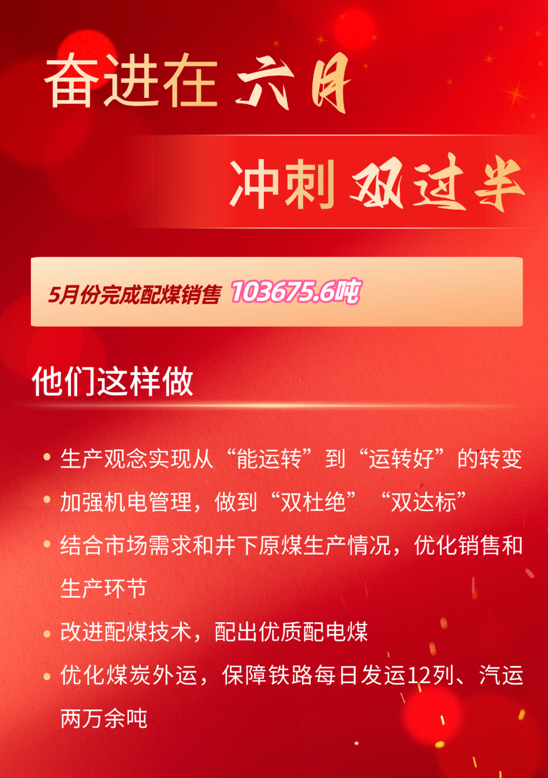 近日,一矿选煤厂传来消息,该厂5月份完成配煤销售103675.6吨,打破建厂以来历史纪录。