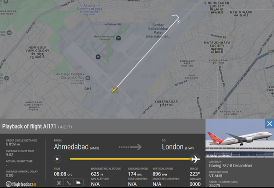 印度航空发表声明证实,该飞机为一架计划从艾哈迈达巴德机场起飞前往伦敦的客机,航班号为AI171。
